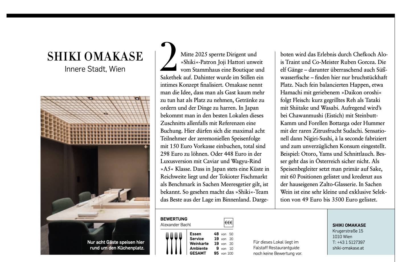 Mitte 2025 sperrte Dirigent und »Shiki«-Patron Joji Hattori unweit vom Stammhaus eine Boutique und Sakethek auf. Dahinter wurde im Stillen ein intimes Konzept finalisiert. Omakase nennt man die Idee, dass man als Gast kaum mehr zu tun hat als Platz zu nehmen, Getränke zu ordern und der Dinge zu harren. In Japan bekommt man in den besten Lokalen dieses Zuschnitts allenfalls mit Referenzen eine Buchung. Hier dürfen sich die maximal acht Teilnehmer der zeremoniellen Speisenfolge mit 150 Euro Vorkasse einbuchen, total sind 298 Euro zu löhnen. Oder 448 Euro in der Luxusversion mit Caviar und Wagyu-Rind »A5« Klasse. Dass in Japan stets eine Küste in Reichweite liegt und der Tokioter Fischmarkt als Benchmark in Sachen Meeresgetier gilt, ist bekannt. So gesehen macht das »Shiki«-Team das Beste aus der Lage im Binnenland. Dargeboten wird das Erlebnis durch Chefkoch Alois Traint und Co-Meister Ruben Gorcea. Die elf Gänge – darunter überraschend auch Süßwasserfische – finden hier nur bruchstückhaft Platz. Nach fein balancierten Happen, etwa Hamachi mit geriebenem »Daikon oroshi« folgt Fleisch: kurz gegrilltes Reh als Tataki mit Shiitake und Wasabi. Aufregend wird’s bei Chawanmushi (Eistich) mit Steinbutt-Kamm und Forellen Bottarga oder Hummer mit der raren Zitrusfrucht Sudachi. Sensationell dann Nigiri-Sushi, à la seconde fabriziert und zum unverzüglichen Konsum eingestellt. Beispiel: Otoro, Yams und Schnittlauch. Besser geht das in Österreich sicher nicht. Als Speisenbegleiter setzt man primär auf Sake, mit 60 Positionen gelistet und kredenzt aus der hauseigenen Zalto-Glasserie. In Sachen Wein ist eine sehr kleine und exklusive Selektion von 49 Euro bis 3500 Euro gelistet.
